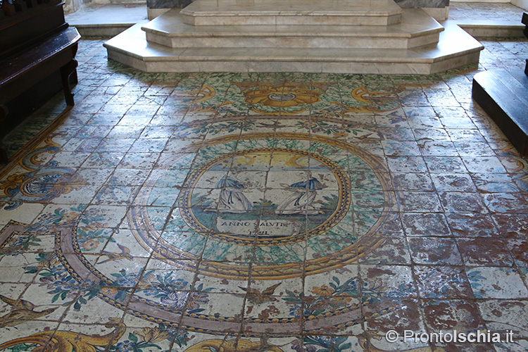 A terra c’è un pavimento maiolicato realizzato nell’officina della famiglia Chiaiese, storici ceramisti napoletani molto attivi nel corso del XVIII secolo. Anche le riggiole che decorano la doppia rampa di scale della Chiesa del Soccorso hanno la stessa provenienza e identici motivi floreali con l’abbinamento della vite e il limone, ancora oggi simboli indiscussi dell’agricoltura mediterranea. Purtroppo, il pessimo stato di conservazione del pavimento impedisce di apprezzare a pieno la maestria di questi artigiani, autori, tra le tante opere, del rivestimento della cupola di San Marcellino e del pavimento di Santa Chiara a Napoli, quest’ultimo andato poi distrutto insieme a grossa parte della basilica durante i terribili bombardamenti alleati del 1943.