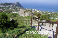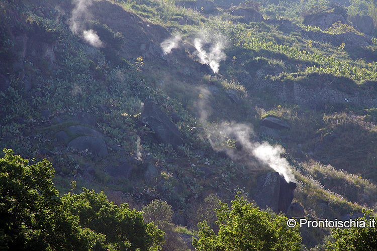 Meno di un chilometro e si arriva nei pressi di una fumarola - lungo i fianchi della montagna se ne vedono molte altre - in posizione panoramicissima, con lo sfondo di tutto il litorale di Forio e il primo piano di Punta Imperatore, la collina che cinge la famosissima