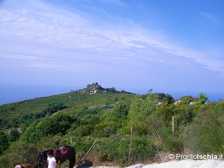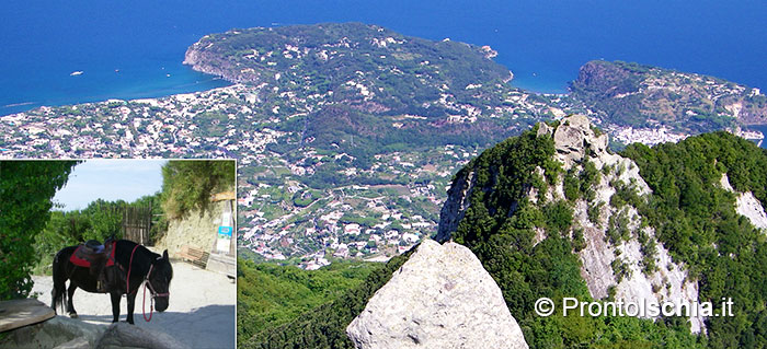 eremo di San Nicola, uno dei più importanti esempi di architettura rupestre dell’isola d’Ischia. Ogni cavallo ha un portatore che coordina a piedi la fase di salita lungo una mulattiera che mano mano si restringe fino a diventare una canaletta stretta scavata direttamente nella roccia di tufo. Dalla chiesina guadagnare la vetta è un gioco da ragazzi, oltre che essere quasi un obbligo una volta arrivati fin quassù.