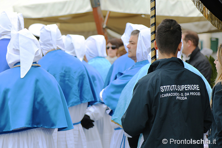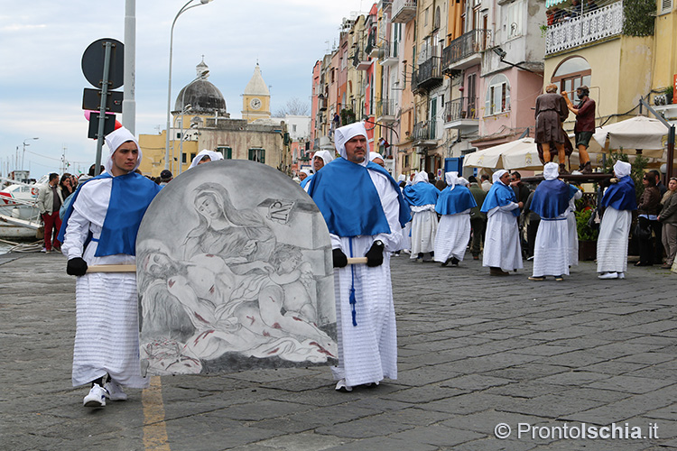 Ai "Misteri" frutto dell’inventiva e dell’immaginazione dei giovani procidani, fanno seguito le statue della Madonna dell’Addolorata e del Cristo Morto. Dietro quest’ultima, il corteo dei fedeli aperto dalle autorità della piccola comunità procidana. Sono però gli "